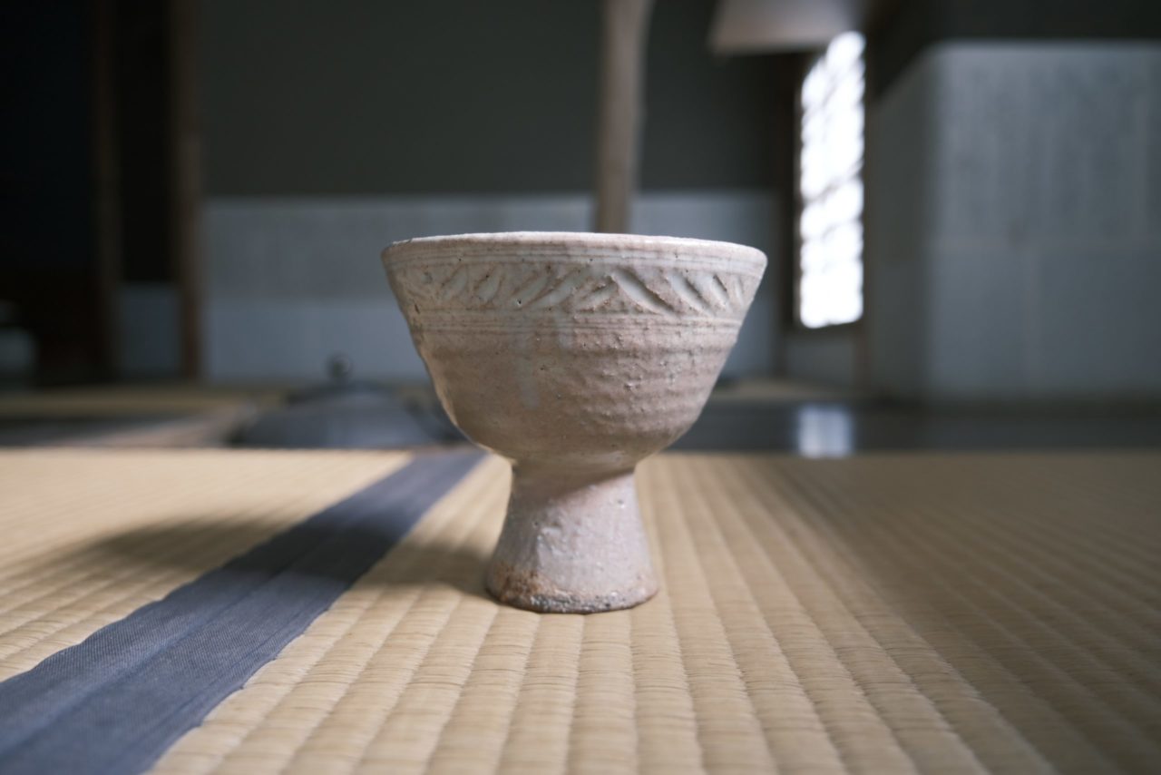 岐阜は戦国時代の中心地。そして戦国武将達は常に死と隣り合わせでした。そんな彼らのリラックス方法は「抹茶」。陣中茶や野点(のだて)など戦地に赴く際は屋外でお抹茶を楽しむ習慣がありました。馬に乗っていながら、お抹茶を楽しめるように考案されたのが「馬上杯(ばじょうはい)」。これは高台を高くすることで片手でもお抹茶を一服できます。今回はこちらのお席でも実際使わせていただきます!