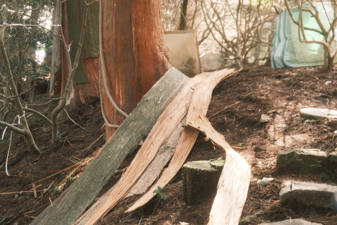 檜皮葺き(ひわだぶき)屋根の材料となる檜皮(ひわだ)を採取する職人のことです。檜皮は、樹齢80年以上のヒノキの立木から採取され、原皮師は特殊なヘラを使い、木を傷つけないように丁寧に樹皮を剥ぎ取ります。